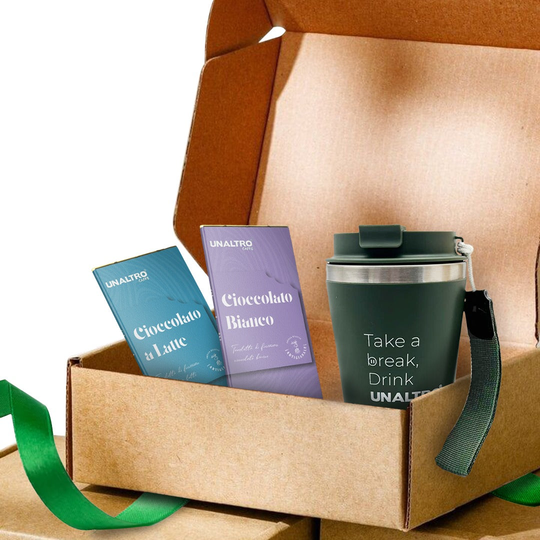Dolcezza e comfort in un unico regalo: due cioccolate artigianali e un Mug termica per gustare caffè ovunque. Perfetta per coccolare chi ami con un momento caldo e speciale.